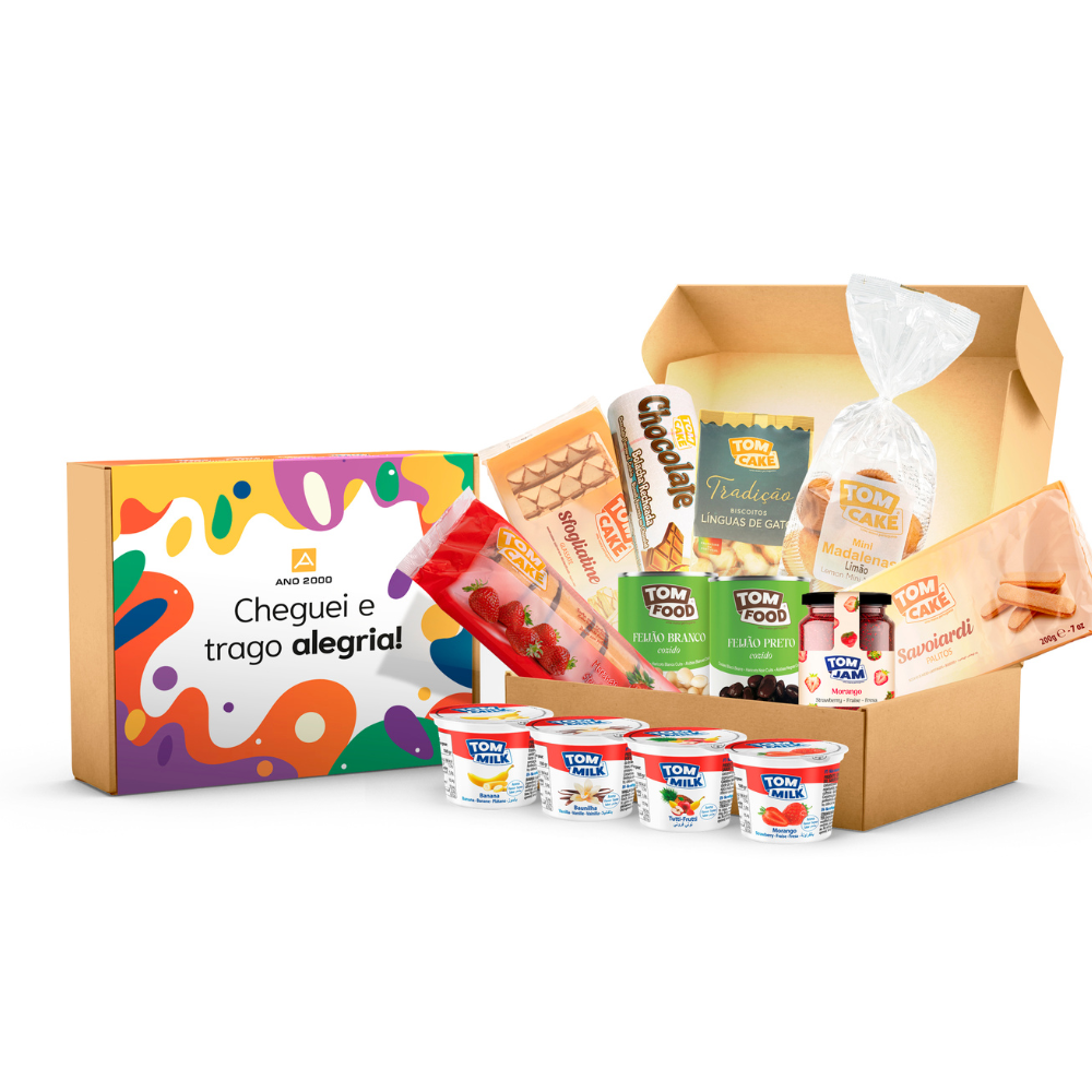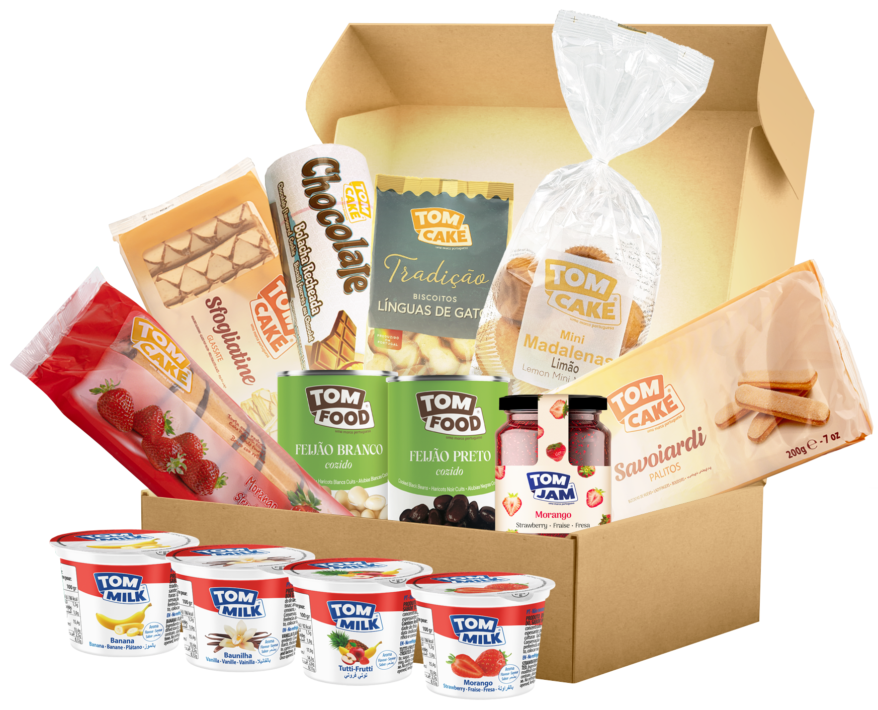 4 iogurtes Tom Milk, 1 compota de morango Tom Jam, 2 latas de feijões Tom Food e 1 seleção de bolos e bolachas Tom Cake.